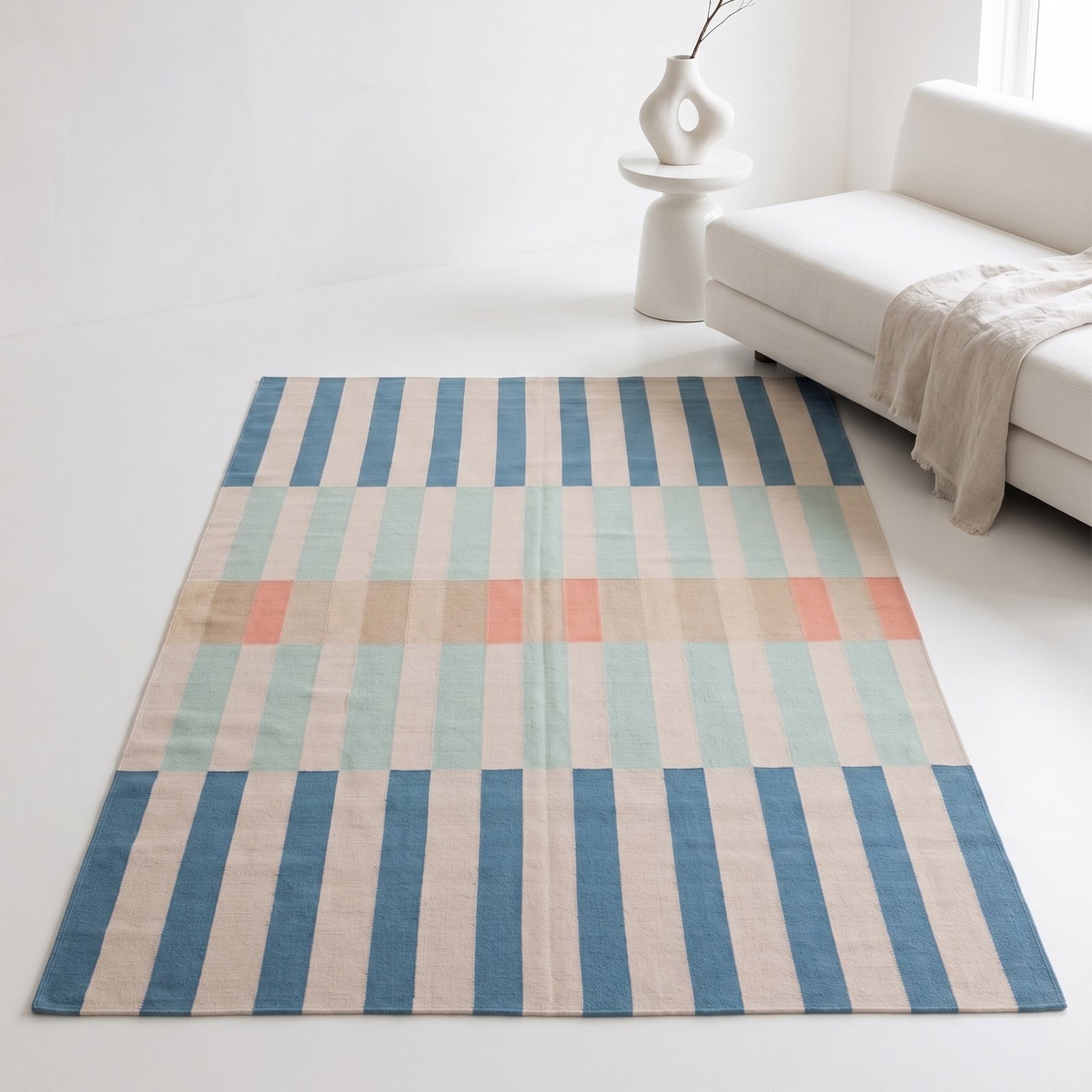 This flatweave (Dhurrie) rug is thin and low-pile, making it easy to maintain and ideal for high-traffic areas. It works beautifully in living rooms, bedrooms, dining areas, hallways, and entryways, offering both style and practicality.